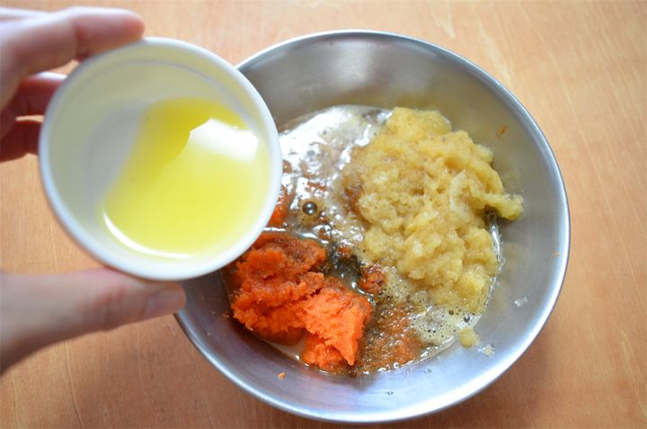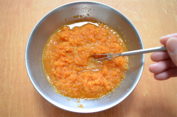 5. 3のすりおろしたにんじんとりんご、4のレモン汁、[A]を混ぜ合わせ、ドレッシングを作る。