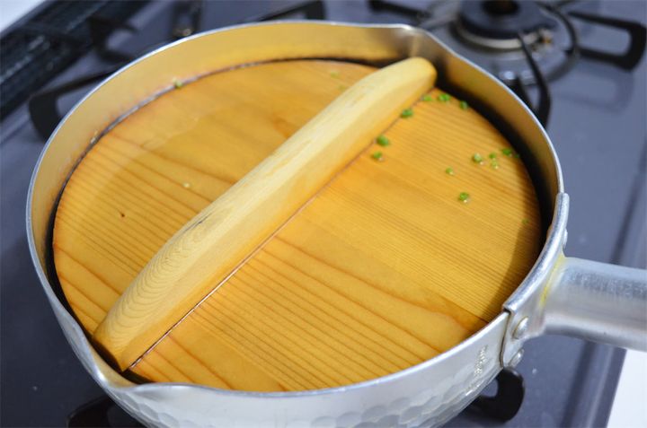 わらびが水に浸かるよう落としブタをしました。なければアルミホイルやお皿でもOK。