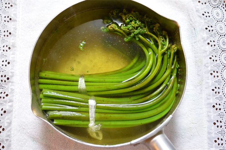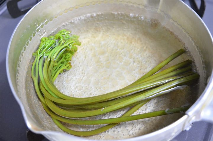 わらびのアク抜きをする。