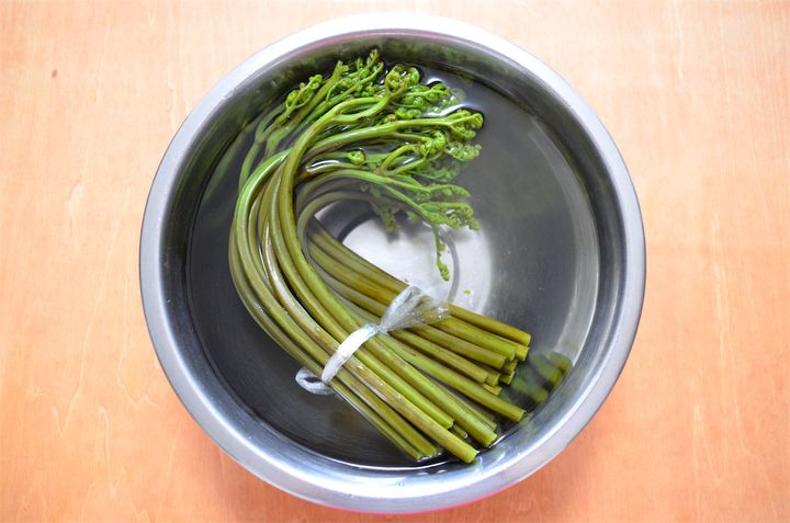 わらびは水洗いをし、根元の切り口を少し切り落とす。
