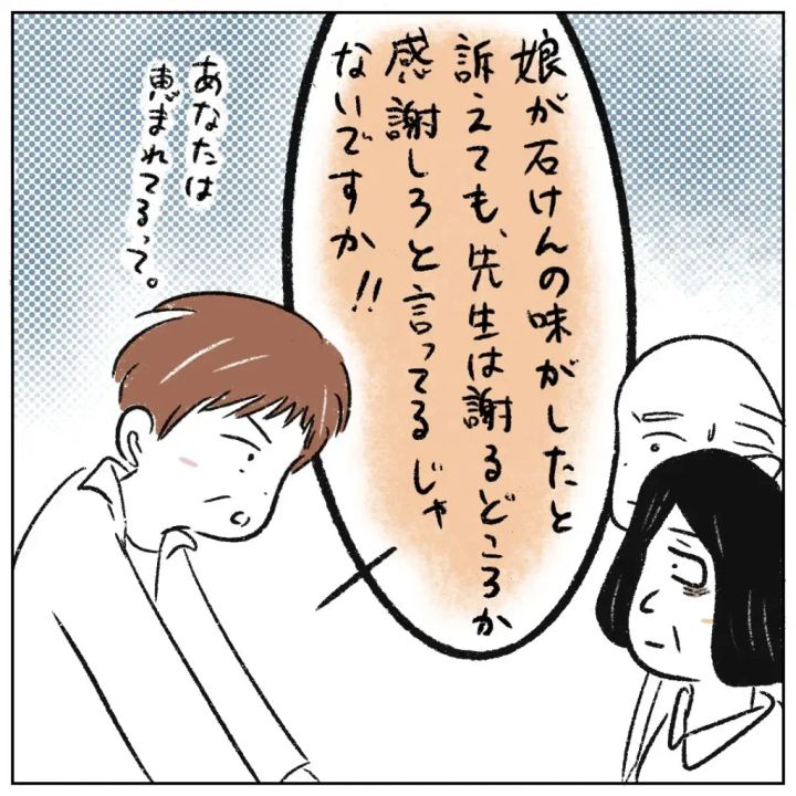まるさんのお母さんは言葉を遮って「娘が石けんの味がしたと訴えても、先生は謝るどころか感謝しろと言ってるじゃないですか!」と性根先生に逃げる隙など与えないのでした。