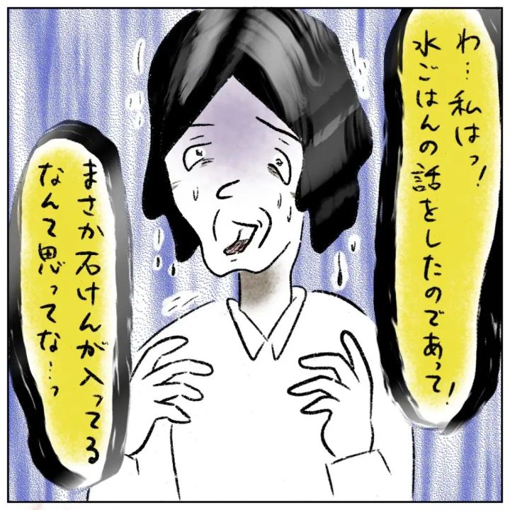 「わ、私はっ!水ごはんの話をしたのであって!まさか石けんが入ってるなんて思ってな・・・」それでも必死に言い逃れようとしましたが