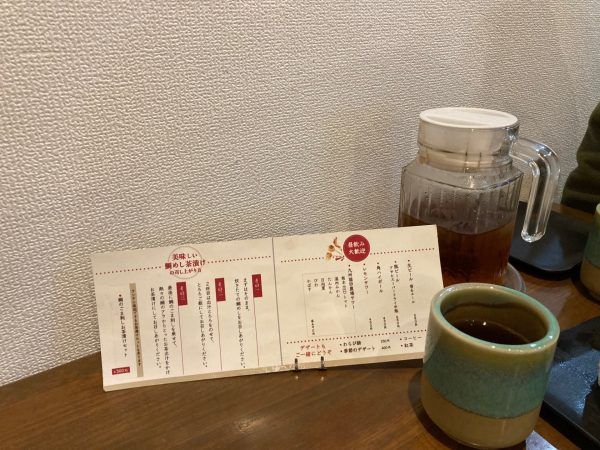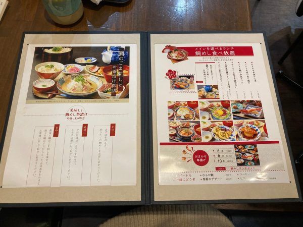 ランチメニューは、メインが選べる鯛めし食べ放題メニューが6種類もあります。 内容は、お任せ串あげ5本(1480円)、ブリ大根の照り焼き(1300円)、ブリと鯛の和豚ユッケ(1300円)、サーモンと茄子の揚げ出し(1300円)、広島産牡蠣フライ(1300円)、ふわふわたまごのカツとじ(1100円)となっていて、追加300円で鯛茶漬けが味わえます。 その他、単品でおまかせ串揚げ(6本、8本、10本)も注文できます。 このお値段で鯛めし食べ放題は安すぎて驚きです!!