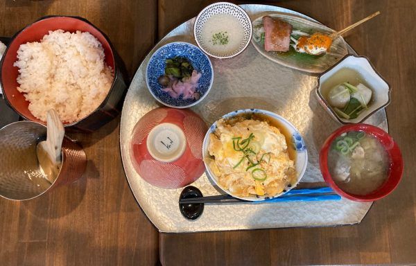 この日はメインをふわふわたまごのカツとじを注文。 お味噌汁は具沢山。副菜も豊富で感動。 味変できるようにとろろ汁があり、ローストビーフ巻きやサーモンの串あげにいくらが添えられたタルタルソースなどなど…。 何よりおひつで鯛めしが出てきてしゃもじも銅グラスに入れて持ってきてくださるので食欲がこみ上げます。