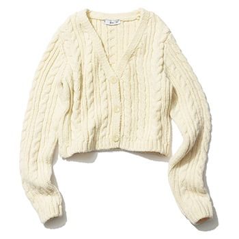 白ケーブルニットショートカーディガン 9,990円/MANGO 1枚で着られる、ほどよいVネックの開き。あたたかい日はフロントを開け羽織りとしても重宝。