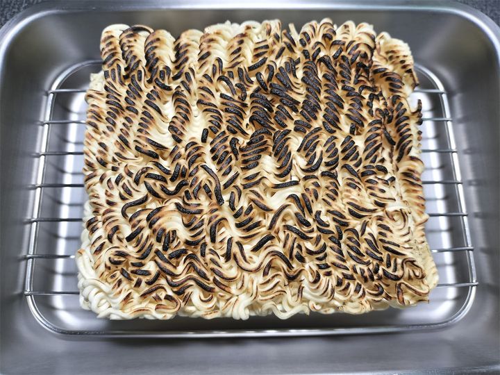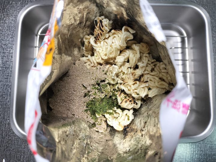 さて、本来加熱調理用に作られている袋麺ですが、本来の作り方とは異なるものの一度油で揚げていますので、そのまま食べることも可能です。実は今回バーナーで表面を炙ったときに、焦げると同時に少しだけ火が出ました。これはおそらく麺の表面や内側に残った油が燃えたものだと思いますが、まぁ仕方ないと思います。アラビヤン焼きそば以外にも粉末ソース式の袋麺はありますが、そもそも茹でて焼くことを前提に作られていますので、加熱処理なしの袋麺で試すのは絶対にダメです。試すにしても、必ず袋の裏を確認してからにしましょう。