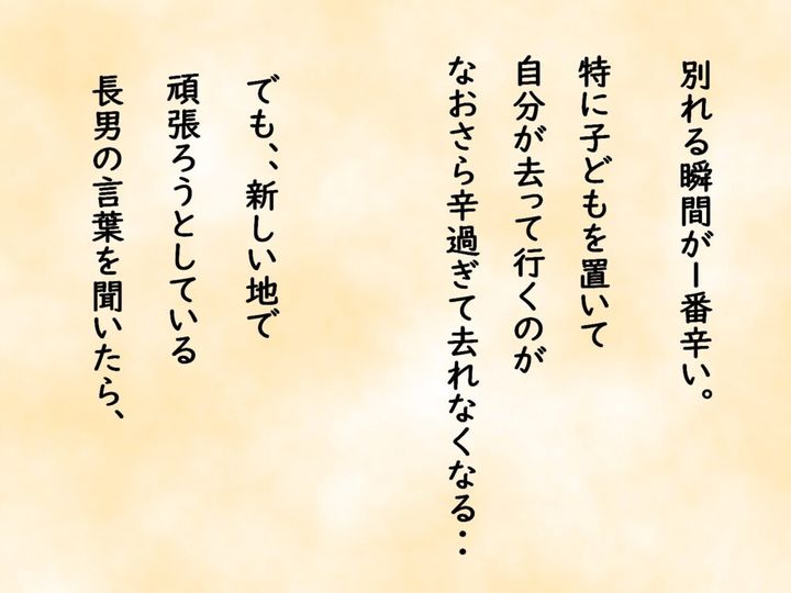 てる子さんが一番辛かったのは別れる瞬間でした。特に、子どもを置いて自分が去ることがなおさら辛く感じてなかなか去ることができなかったそう。でも・・新しい地で頑張ろうとしている長男くんの言葉を聞いたら、