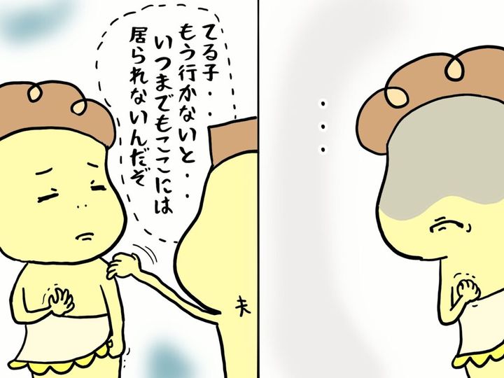 「・・・」長男くんに何か声をかけたいけれど、言葉が出て来ず立ち尽くすてる子さん。見かねたご主人が「てる子・・もう行かないと・・いつまでもここには居られないんだぞ」と小さな声で言いました。