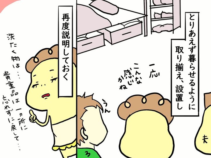 とりあえず生活できるように物を揃えて設置し、洗濯物や貴重品などの取り扱いについて再度長男くんに説明したてる子さん。