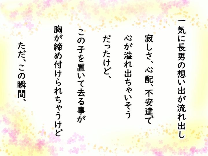 長男くんの思い出が一気に流れ出したてる子さんは、寂しさ、心配、不安たちで心が溢れそうでした。そして、息子くんを置いて帰ることに胸が締め付けられましたが、同時に・・