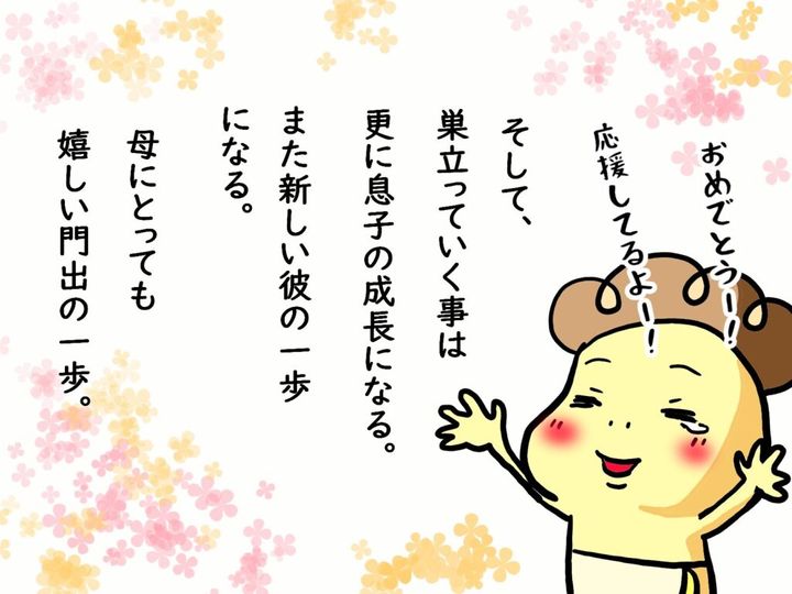 そして、てる子さんはこうも思いました。「巣立っていく事は更に息子の成長になる。また新しい彼の一歩になる。母にとっても嬉しい門出の一歩」