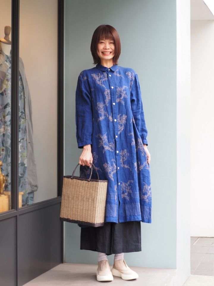 「ケイ ハヤマ プリュス」のワンピースは、ブルーの生地に映えるボタニカル刺しゅうがポイント。一枚でコーディネートが完成する主役級アイテムで、コーディネートを華やかに彩ります。