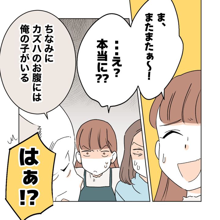 「俺のカミさん」と父親に言われ、「はぁぁぁぁぁああ??」と驚くカナメさんのアケミさんとケイコさん。「ま、またまたぁ~・・え?本当に??」と全く信じられない様子だったのですが、「ちなみにカズハのお腹には俺の子がいる」義父の言葉に「はあ!?」と大きな声をあげました。