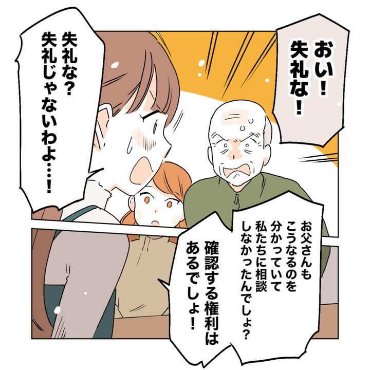黙って聞いていた義父が、「おい!失礼な!」と大きな声で言うと、「失礼な?失礼じゃないわよ・・!お父さんも、こうなるのを分かっていて私たちに相談しなかったんでしょ?確認する権利はあるでしょ!」と娘としての権利をふりかざし、義父に言いました。