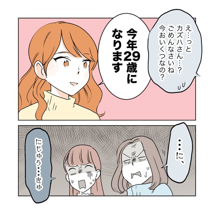 そして、「え・・・っとカズハさん・・?ごめんなさいね、今おいくつなの?」とたずねると、「今年29歳になります」そう言われて「・・・に、にじゅう・・きゅ」と言葉を失うアケミさんとケイコさんは、