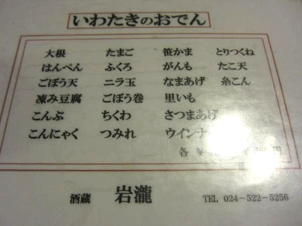 福島市宮町にある老舗の「酒蔵 岩瀧」さんで、名物のおでんと、日本酒を楽しんできました。