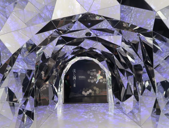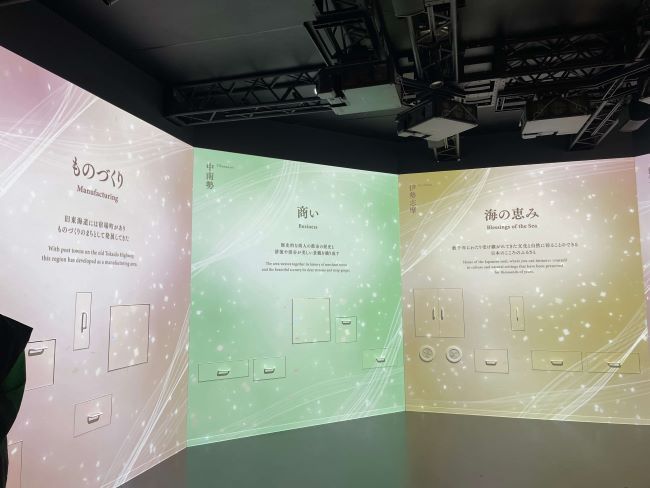 三重県の豊かな自然や食など「美し国みえ」の魅力を、エンタテイメント型の空間演出で楽しめるブース。キラキラと輝く幻想的なトンネルを抜けると、三重県内の映像を投影する「~美し国みえ体験広場~」が広がります。ここでは県内5エリアの美しい風景など魅力的な映像が映し出されるほか、壁面には引き出しがあり、開けるとオオサンショウウオの模型や、手裏剣、伊勢茶の香りが体験できたりと、ワクワクするような仕掛けが隠れています。個人的には北勢エリアの「日本酒の香り」体験がおすすめ! そしてブースのアテンダントさんの忍者風衣裳にも注目を。