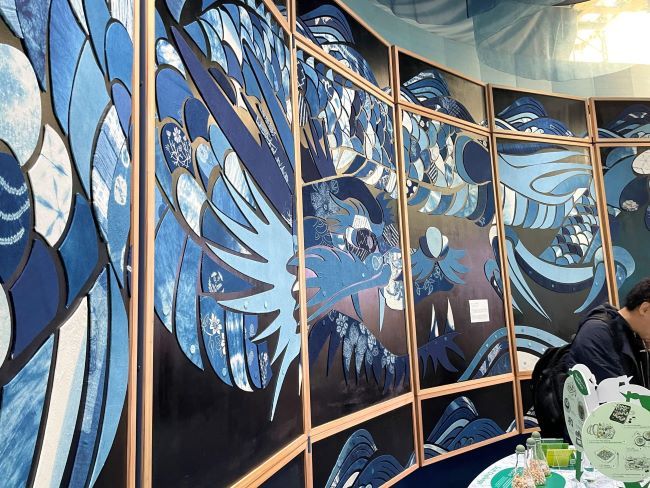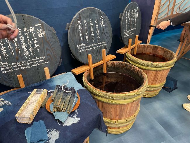 ブースに入ると聞こえてくる「ヤットサー!」の掛け声。世界に誇る伝統芸能「阿波おどり」をプロジェクションマッピングでリアルに体感できます。また徳島の伝統工芸「阿波藍染」の体験も。早速体験させてもらいましたが、発酵させて作るという藍染料の意外なにおいに驚き。初めて知りました。藍色で統一されたブースや展示された大きな藍染アートがとってもオシャレです。
