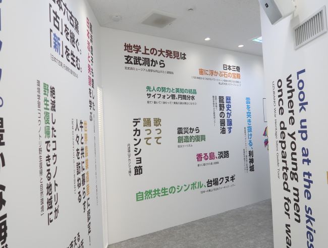 入り口の大きなコウノトリにいざなわれて中に入ると、タイポグラフィでさまざまな兵庫名物が表示されたアート・コリドーが。その先には兵庫県の魅力を体感する「ミライバス」が待っています。空を飛び時空を駆け抜けるバスに乗って、国産み神話から始まる兵庫の魅力を臨場感満載の映像で見せてくれます。子どもだけでなく大人も楽しめる、アトラクション型映像空間でした。