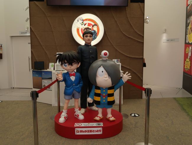 入り口で出迎えてくれるのは、「まんが王国とっとり」の3巨匠。水木しげる先生、谷口ジロー先生、青山剛昌先生のキャラクターたち。ファンにはたまりませんね! 時間が合わなくて見学できなかったのですが、メイン展示では、なんとブース内に実際に砂をしきつめて鳥取砂丘を再現しているそう。床面に虫眼鏡デバイスをかざすことで、観光・グルメ・工芸など鳥取県の魅力アイテムを発見するという、宝探し的な体験ができます。