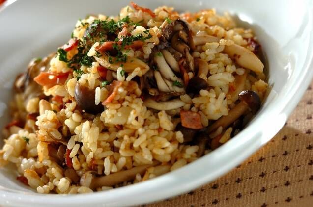 免疫力を高めると言われているキノコをたっぷり使います。刻んだガーリックを入れるため、やや洋風の味わいです。ごはんと卵はあらかじめ混ぜておき、ほぐすように炒めるとパラパラに仕上がります。