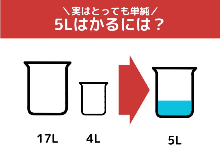 3. 【クイズ】実は単純!誰でも簡単に解けるはず?「17Lと4Lの容器で5L」をはかるには?