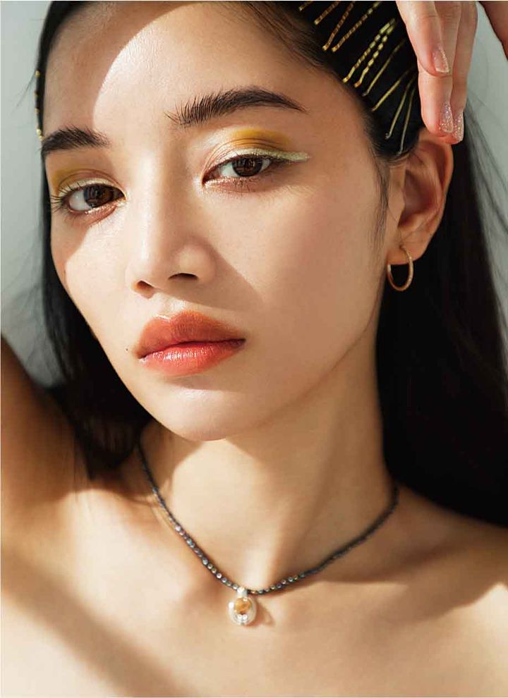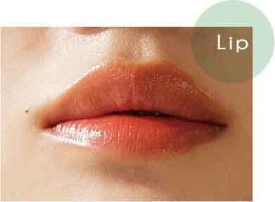 Eのリップを唇全体にたっぷり塗る。透け感のあるオレンジが肌によくなじみ、美しいツヤが引き立つ。