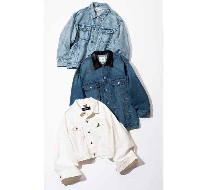 〈上から〉(モデル着用)デニムジャケット¥49,500(THIRD MAGAZINE)衿レザーデニムジャケット¥23,100(アルページュストーリー/アルページュストーリー プレスルーム)白デニムジャケット¥28,600(Lee × styling//styling/ ルミネ新宿1店)
