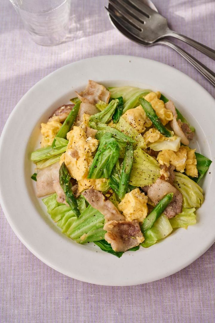春キャベツとアスパラの甘さを生かして、味つけはシンプルに塩だけで。ふわっふわの卵も格別のおいしさです。