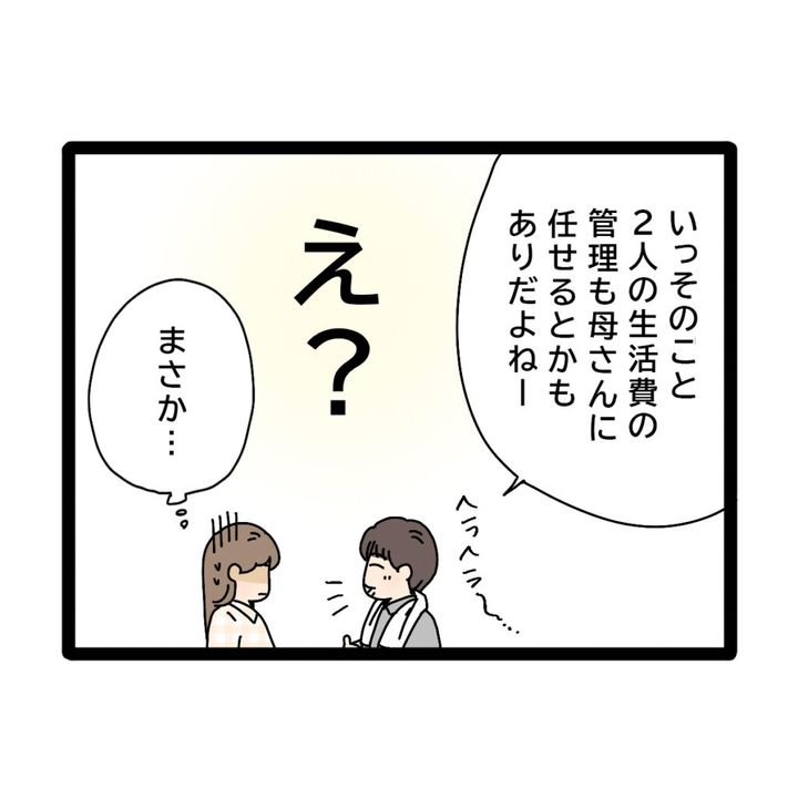 さらに、「いっそのこと、2人の生活費の管理も母さんに任せるとかもありだよねー」ヘラヘラしながらそう言うコウタさんの言葉に、「え?」と疑問だらけのアヤカさん。「まさか・・」と心の中で呟いた後、