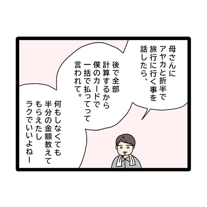 「母さんにアヤカと折半で旅行に行く事を話したら、後で全部計算するから、僕のカードで一括で払ってって言われて。何もしなくても半分の金額教えてもらえたし、楽でいいよねー」