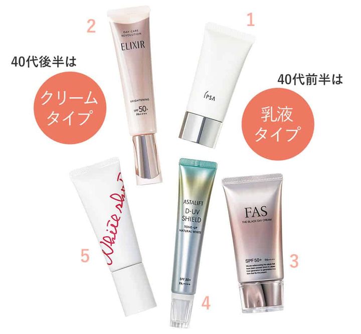 UVケアは40代はマスト。40代前半は保湿力があれば乳液タイプでOK。シワや表情崩れが気になる40代後半は、高保湿&密着力のあるクリームタイプを選んで。