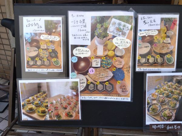 ちぃさんのおすすめは、主菜に豆皿がたくさんの一汁千菜ご膳! 一食に、およそ30品目の野菜を使っているそうですよ。はなうた定食は、主菜なしでちょこっとずつのたくさんの豆皿が並び、目にも楽しい~。こちらも野菜がいっぱいですよね。そして、ちぃ定食はしっかり味でご飯がススム主菜がメインで豆皿も。内容は、どれも週替わりのお任せですよ。
