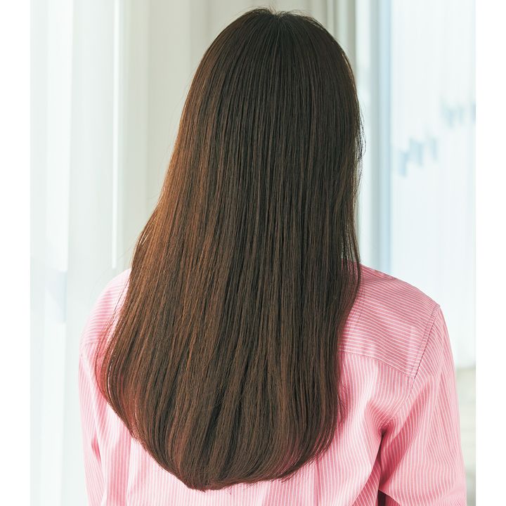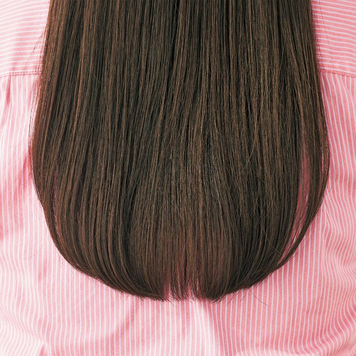 アルカリ酸熱トリートメントもしているので、浮き毛やうねりが抑えられています。どの角度からでもツヤツヤで若々しい髪に見えます。