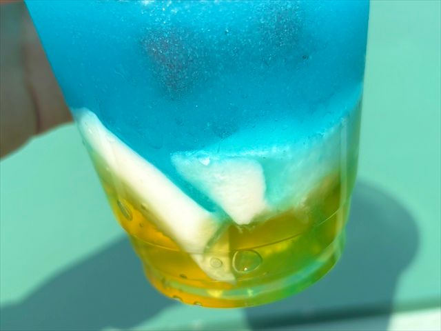 ブルーゼリーとマンゴーダイス、トロピカルフルーツソースでドナルドカラーを表現。特にマンゴーの果肉が濃厚で爽やかさの中にもしっかりと甘さがあります。