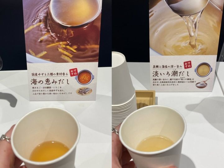 発表会終了後、おだしの試飲を。今回新しく登場する2種をいただきました。「真鯛と藻塩の深い旨み 淡いろ潮だし」は、真鯛の風味がたち美味。まずはおだしのみで堪能したい上品な味です。「国産ゆずと三種の素材香る 海の恵みだし」は、ゆずの皮も入っていて食感も香りも楽しめました。あったかいものを食べながらも爽やかな気分にも浸れるおだしです。