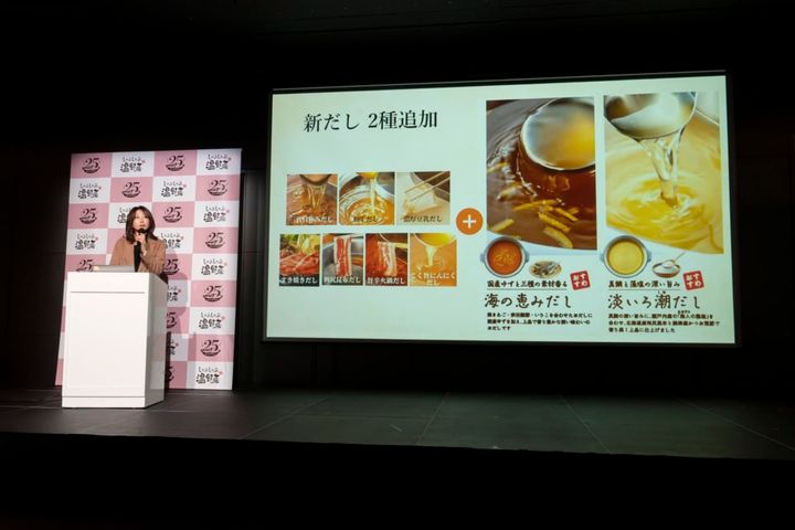 温野菜マーケティング部部長の杉山仁美さんが、創業25周年を記念して2025年4月9日より、これまで7種だったおだしが9種となり、サイドメニュー7品、デザート3品が新たに加わることを発表。一部店舗限定で、契約農家の野菜を購入できる「こだわり旬野菜」も開始予定とのこと。
