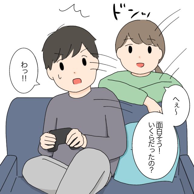すると、「へぇ~、面白そう!いくらだったの?」と背後から近づいて声をかけるかなえさんに「わっ!!」たかしさんが驚きました。