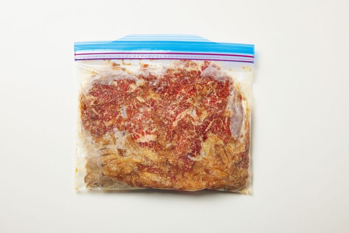 (2)小さめの冷凍用保存袋※4枚に、〈A〉を1/4量ずつ入れて混ぜ、牛肉、ごぼうを1/4量ずつ加える。空気を抜きながら口を閉じ、調味料をもみ込んで薄く平らに整え、冷凍庫に入れる。