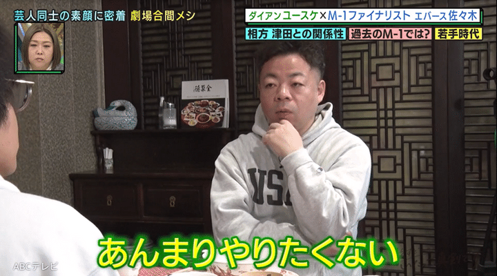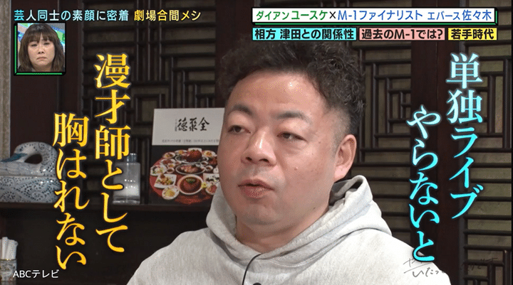 そんなダイアンのユースケと、彼に憧れて芸人になった後輩・エバースの佐々木隆史が、2人きりで語り合った。その中で佐々木は、「(売れたあとも)毎年新ネタで単独ライブをやる理由とかってあるんですか?」と質問。するとユースケは、「ホンマのこと言うたら、(単独ライブは)あんまりやりたくない。すごく大変やから」と本音を明かした。