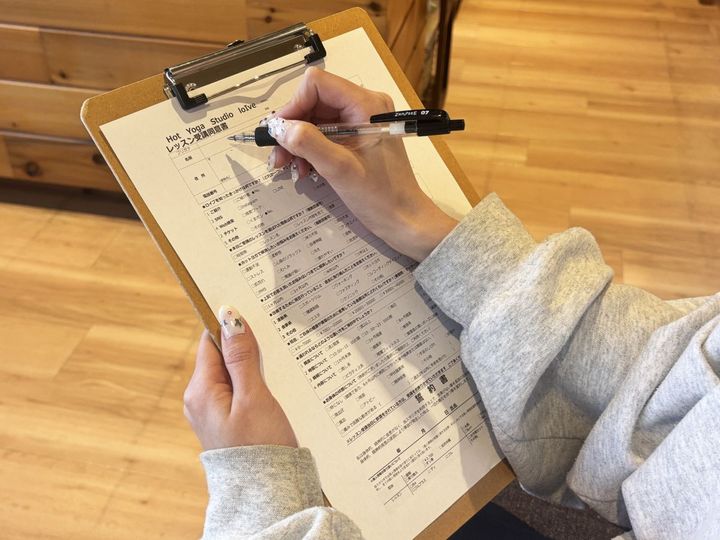 受付が終わったら、アンケートに記入します。「ホットヨガで解消したい悩み」や「現在行っている運動」など、質問に答えながら毎日を振り返ってみると、改めて運動不足を実感しました。