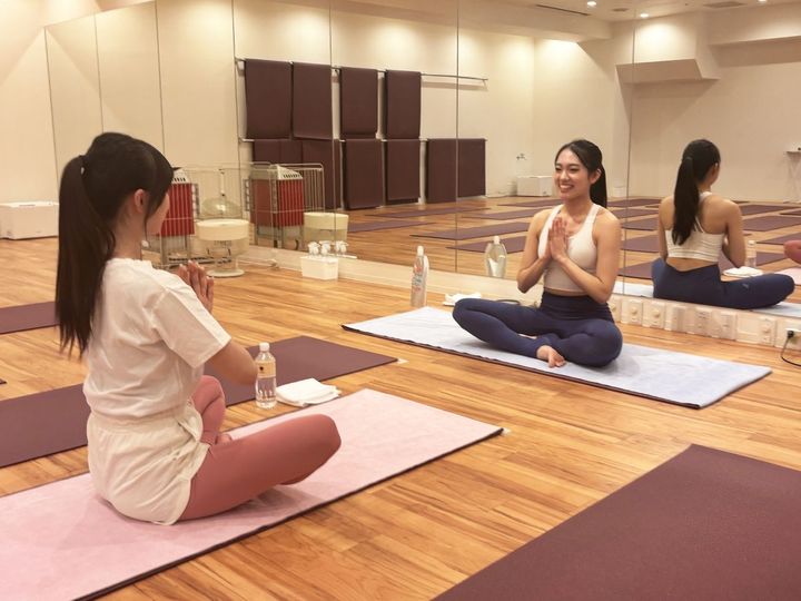 ヨガマットの上であぐらをかいて手を合わせ、挨拶をしてレッスンスタート。一般的にヨガのレッスンは、相手への敬意と感謝の気持ちを込めて、合掌で始まり合掌で終わります。