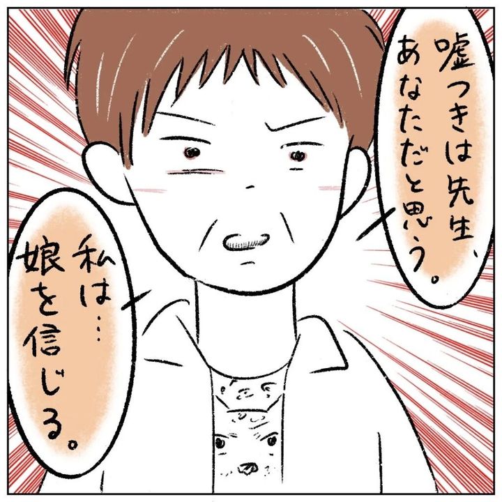 「嘘つきは先生、あなただと思う。私は、娘を信じる。」まるさんのお母さんは顔を上げ、性根先生をキッと正面から見つめてキッパリと反論しました。