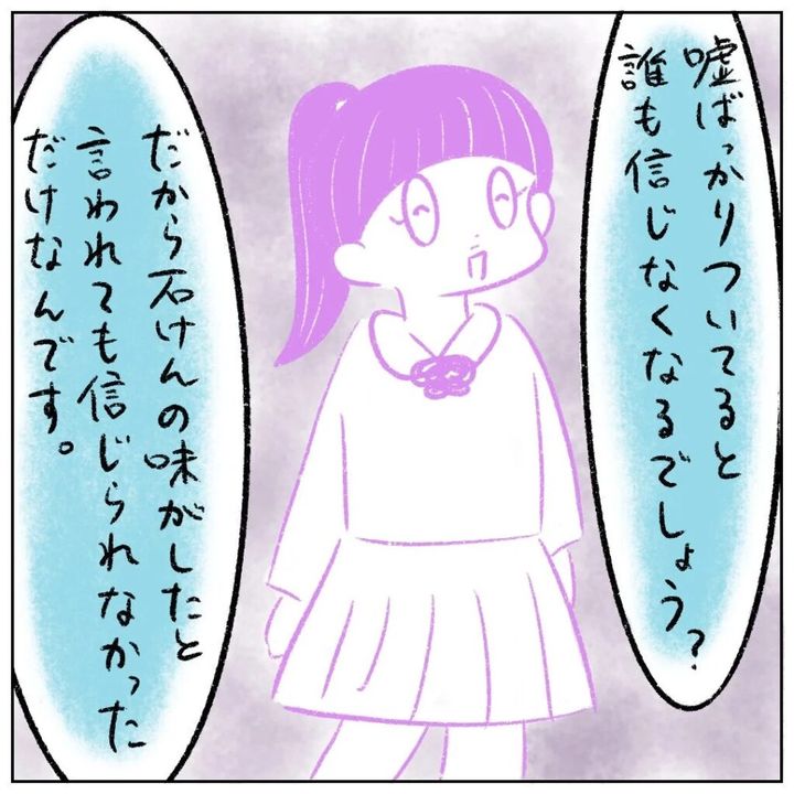 「嘘ばっかりついてると誰も信じなくなるでしょう?だから石けんの味がしたと言われても信じられなかっただけなんです。」と、それこそ嘘の話をもっともらしく言うのでした。