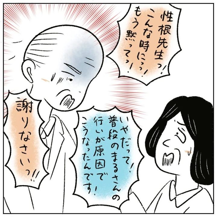 ところが校長先生は、真っ青な顔で「謝りなさい!」と性根先生に強く言いました。それでも「普段のまるさんの行いが原因でこうなったんです」と言い張り、謝る気などない性根先生です。