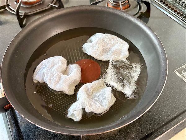 2. 鍋に油を入れ、火をつけます。180~190℃の高温になったところに、1を入れます。油の温度が低いとふわっと揚がらないそうなので気をつけましょう。