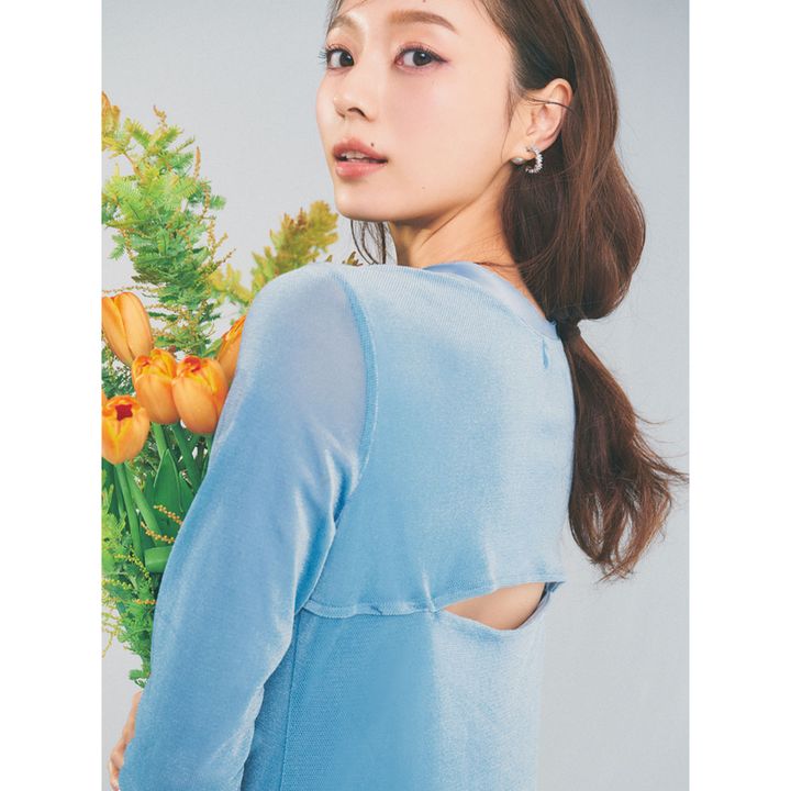 ベロアの光沢感とメッシュの抜け感が新鮮な、春先にぴったりのキレイ色ワンピース。衿周りや袖口には切りっぱなしサテンディテールが施され、こなれ感も抜群です。ワンピース¥19,800(エミ/エミ ニュウマン新宿店)