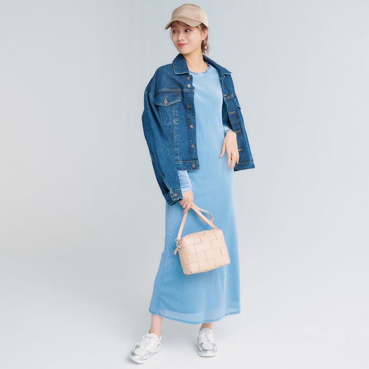 トレンドのデニムジャケットとも好相性!キャップやスニーカーでカジュアルダウン。ワンピース¥19,800(エミ/エミ ニュウマン新宿店)Gジャン¥53,900(エーゴールドイー/ノーブル 有楽町マルイ店)バッグ¥64,900(IACUCCI/IACUCCI 大丸東京店)キャップ¥10,780スニーカー¥25,300(ともにルーニィ)ピアス¥6,600(アビステ)リング¥23,100(フィリアム/フォーティーン ショールーム)