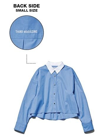クレリックシャツ 33,000円/THIRD MAGAZINE えりと色をそろえた白のブランドロゴが、バックスタイルのさりげない飾りに。ハイウエストパンツにも合うショート丈で着回しもしやすい。
