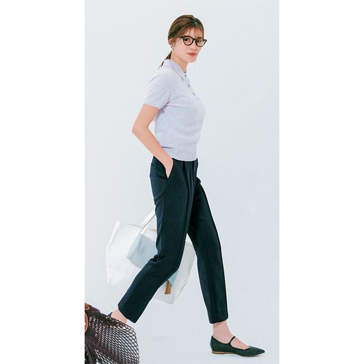 伸びが良く、ウエストも後ろゴムだからマタニティ初期〜中期のママにも◎。パンツ¥17,600(スリースクエア)ニット¥20,000(バナナ・リパブリック)トートバッグ¥9,680(ドレステリア/ドレステリア 渋谷スクランブルスクエア店)バッグ¥33,000チャーム¥5,500〜(ともにVASIC/ヴァジックジャパン)シューズ¥82,500(ペリーコ/アマン)メガネ¥42,900(アイヴァン/アイヴァン 東京ギャラリー)イヤリング¥1,760(アネモネ/サンポークリエイト)